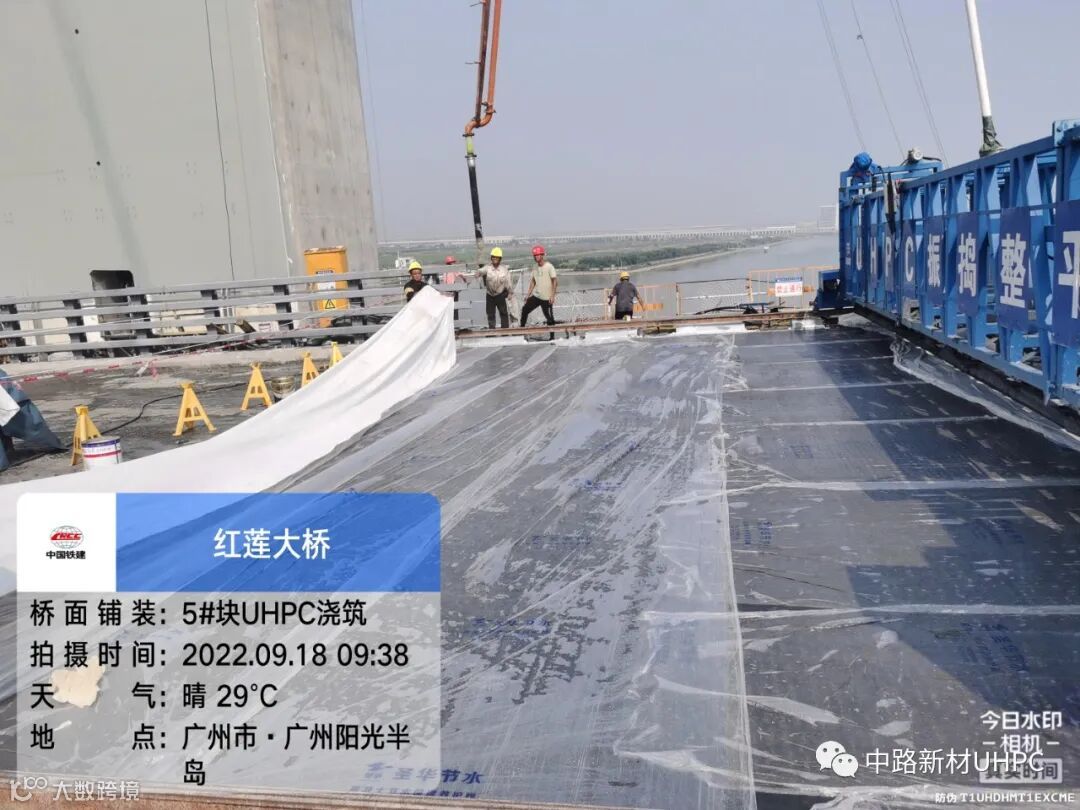 2022年9月18日上午,广州南沙红莲大桥UHPC超高性能轻型组合桥面施工现场传来喜讯,主跨580m双塔双索面梁斜拉桥——红莲大桥的UHPC超高性能轻型组合桥面顺利完成浇筑,标志着粤港澳大湾区首座主跨超500米大桥首次应用。红莲大桥UHPC超高性能轻型组合桥面总面积超过14000余平方米,预计在2022年9月26日完成全部施工内容。
