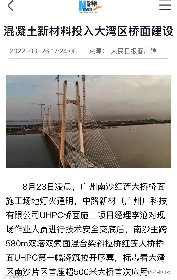 《新华网》报道大湾区首座超500米大桥(红莲大桥)采用超高性能混凝土UHPC