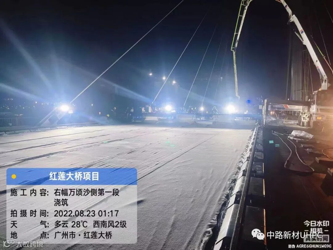 红莲大桥UHPC超高性能轻型组合桥面由中路新材(广州)科技有限公司旗下的湖南中路华程桥梁科技股份有限公司承担专业施工任务,自2022年8月23日凌晨起,全体管理及施工人员发扬敢于攻坚,连续作战,敬业精业的精神,克服高温炎热、台风等不良气候,仅用26天,圆满完成了红莲大桥UHPC超高性能轻型组合桥面浇筑任务。
