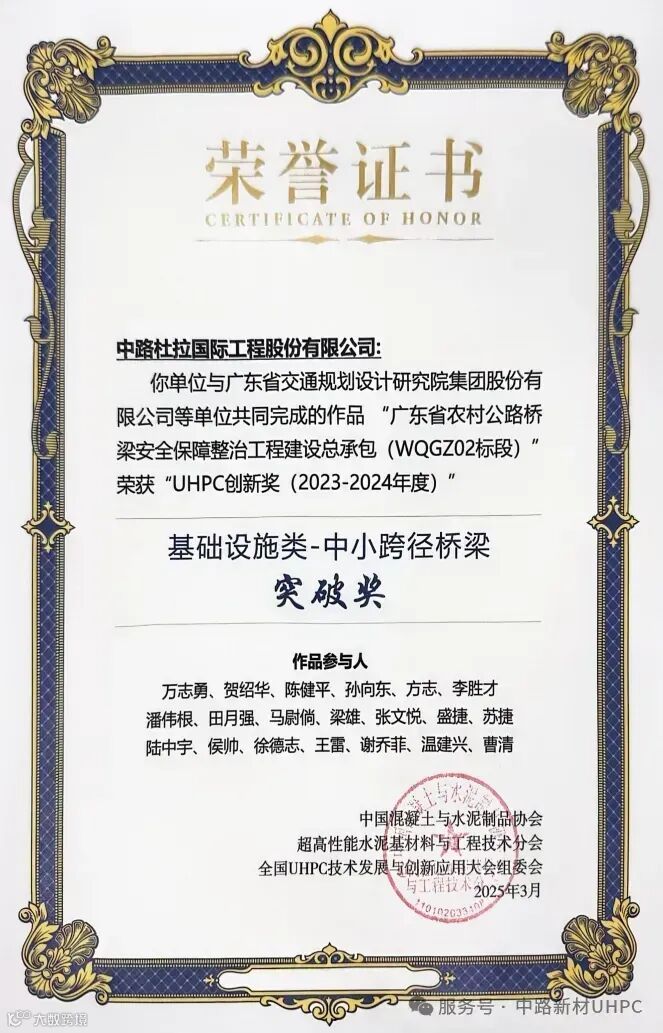 中路新材集团旗下:中路杜拉国际工程股份有限公司和湖南中路华程桥梁科技股份有限公司在本次大会中斩获三个奖项。(详见原文:中国UHPC技术革新成果集中亮相,中路新材荣获三奖!第二届全国UHPC技术发展和创新应用大会圆满落幕!)