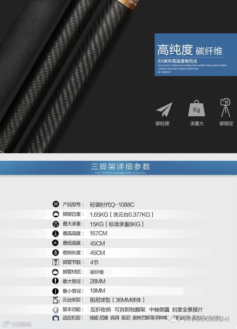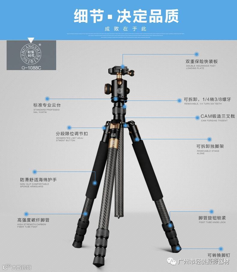 导读:轻装时代Q1088C 单反相机三脚架碳纤维 专业稳固摄影摄像机三角架
