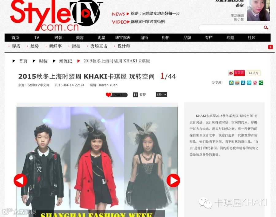 4月14日上海时装周,许多上海的潮爸潮妈都带小朋友一起到现场观看KHAKI卡琪屋2015秋冬新品发布会,“梦幻的开场、震撼的收场”,“这品牌很时尚”,“今天的SHOW很惊喜”~~这些是来自现场观众对这场发布会的评价,同时也让很多时尚界、媒体界的潮人了解KHAKI卡琪屋。现在来回顾时装周的媒体报道吧!