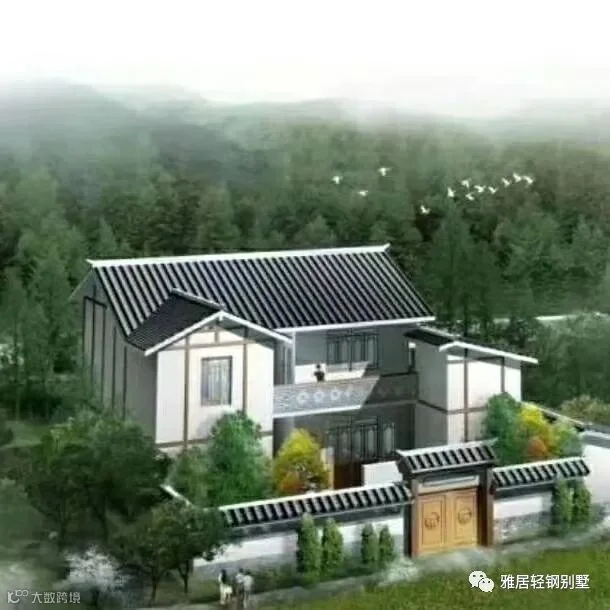 这栋轻钢别墅的外观为中式风格,主体色调为白色,灰色的沥青瓦更衬托出了浓浓的中国风,外墙采用白色和灰色两种装饰板,透露出一种严肃庄重的气息。窗户采用的都是断桥铝窗户,与别墅的整体色彩搭配自然,相得益彰。整体建筑风格也符合我国传统,对称又统一。