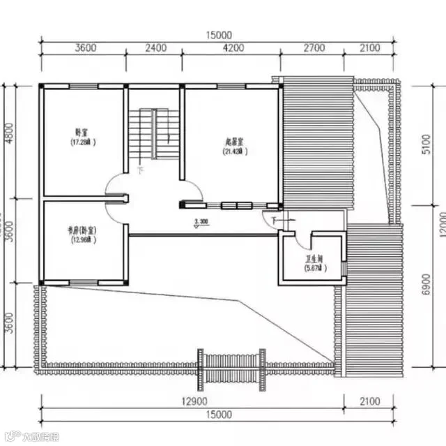 ②二层平面图:二层设有卫生间、书房、卧室、起居室。卧室与书房相连,很好的考虑到了人的作息生活习惯。楼梯的设置将二层房间有序分隔,起居室远离卧室,又与卫生间相近,完全不会影响到卧室中休息的人。