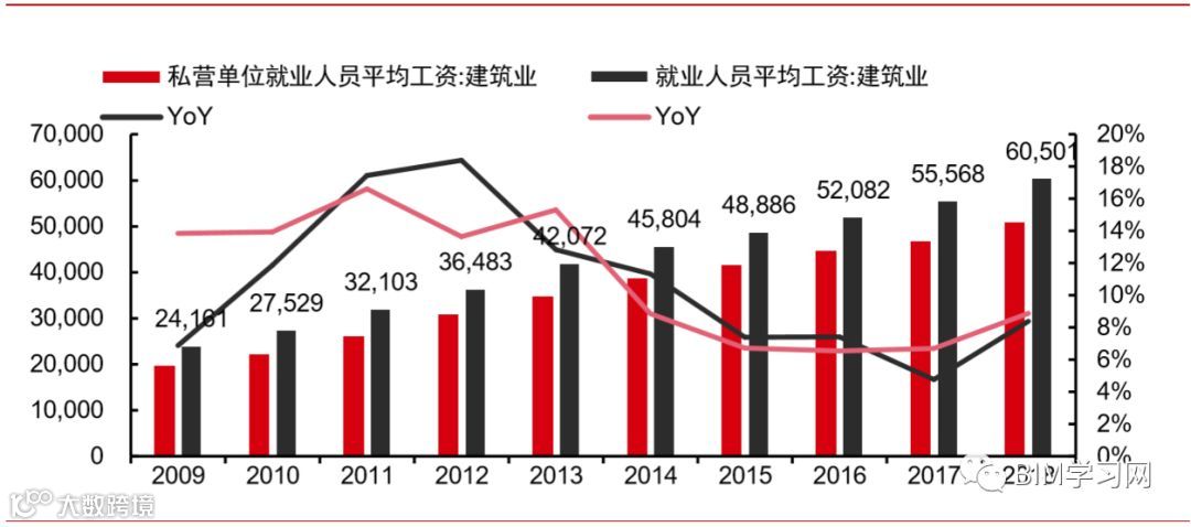 建筑业劳动力成本在快速攀升。2009-2017 年建筑行业私营企业工资的 CAGR 为 12.3%,非私营企业为 11.6%,高于同期高于 GDP 增速。由于传统建筑施工为劳动密集 型产业,且竞争较为充分,人工成本的提高将进一步压缩有限的利润空间。