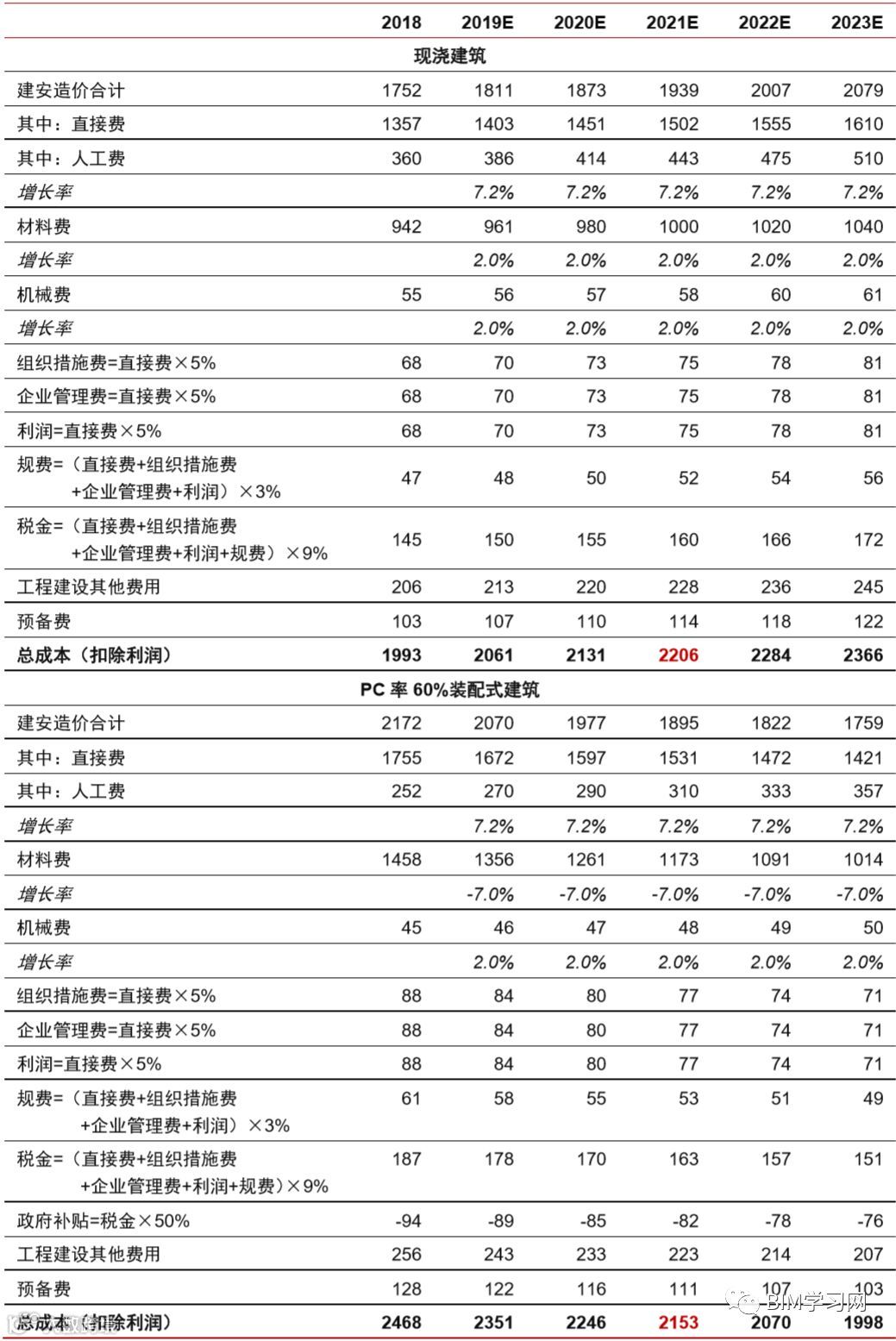 核心假设 2:现浇建筑材料成本为通胀率 2%,考虑规模生成和产能利用率的上升,20%、40%、50%、60%PC 率的材料费增长率分别为-1%、-4%、-6.5%、-7%。