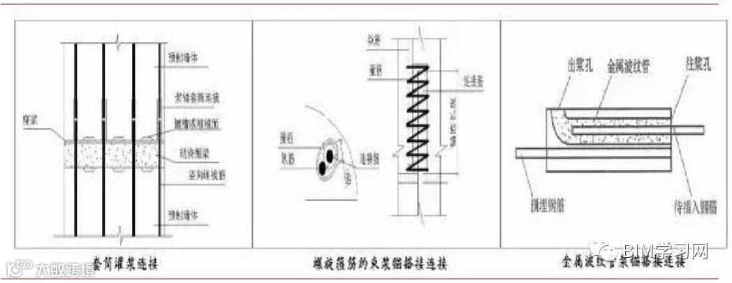 目前常用的三种连接形式:套筒灌浆连接、螺旋箍筋约束浆锚搭接连接、金属波纹管 浆锚搭接连接技术。套筒灌浆连接比其他两种形式的连接成本要高,后两种连接方式有其特定的使用范围,在保证安全的前提下优先使用后两种连接方式,可以大大的减少成本。