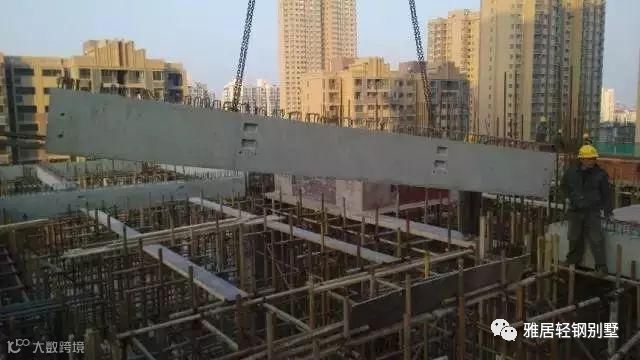 以预制框架结构为例,一层施工完毕后,先吊装上一层柱子,接着上主梁、次梁、楼板。预制构件吊装统统结束后,就开始绑扎连接部位钢筋,最后进行节点和梁板现浇层的浇筑。