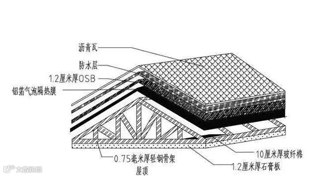 轻钢结构住宅屋面系统是由屋架、结构OSB面板、防水层、轻型屋面瓦组成的。轻钢结构的屋面,外观可以有多种组合。材料也有多种。在保障了防水这一技术的前提下,外观有了许多的选择方案。