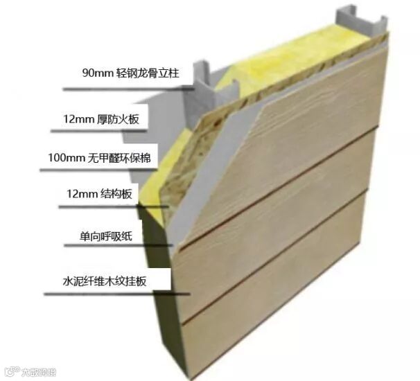 答:普通房间墙体由内向外依次为:内墙装饰-石膏板(硅酸钙板)-轻钢龙骨(龙骨内部含降噪、保温隔音的玻纤棉)-OSB板硅酸钙板-防水层-外墙饰板。