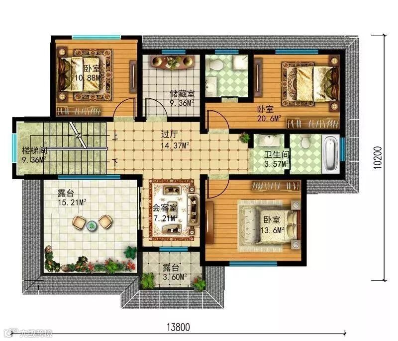 二层:主卧(带独卫)、卧室×2、会客厅、储藏室、露台×2、卫生间。