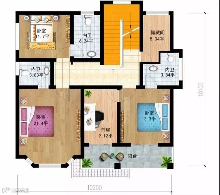 二层:豪华套房(带书房+卫生间+露台)、主卧(带独卫)×2、书房、卧室、储物间。