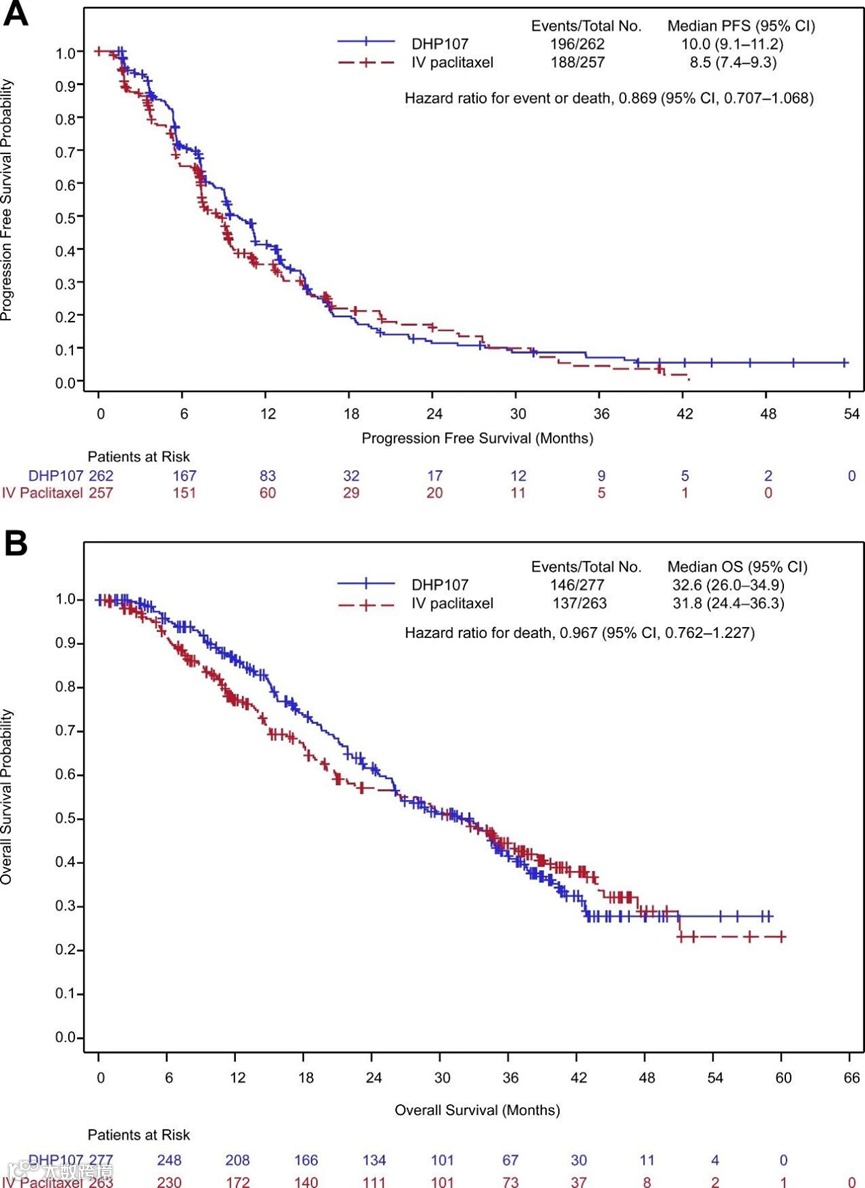 紫杉醇口服溶液和紫杉醇注射液的中位总生存期(mOS)相当,分别为32.6月 vs 31.8个月(HR=0.967;95%CI, 0.762-1.227)。