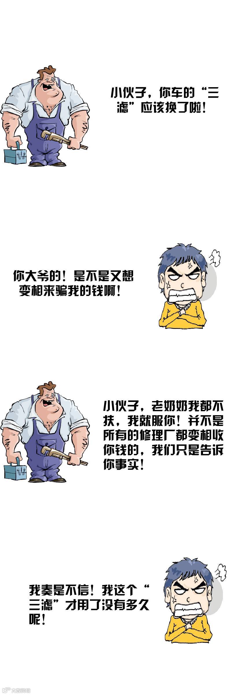 上个礼拜,小胜的朋友到维修厂去修车,修理工告诉他,他车的“三滤”都应该换掉了。但是,双方就是彼此的不信任。