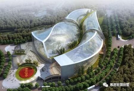 植物园钢结构采用空间网格结构体系,主要受力构件为拱形倒三角管桁架,桁架之间采用单层网壳及次桁架连接,从而形成一个稳定的空间结构受力体系。