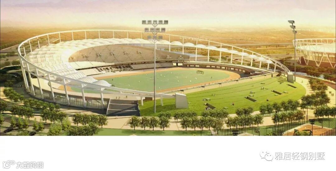 而体育馆和游泳馆屋盖平面投影呈椭圆型,都为覆盖刚性屋面,钢屋盖结构采用索桁式弦支体系,由单层曲面网格结构和空间索桁体系杂交而成。周边V形柱和上下环梁形成的环形桁架为屋盖支撑体系。