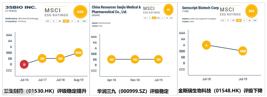 在本次公开结果中,MSCI公布了各医疗保健业上市公司ESG评级连续数年的变化情况。在44家中国医药行业上市公司中,6家公司近三年的评级结果呈提升趋势,24家公司近三年的评级结果保持稳定,3家公司近三年的评级结果呈下降趋势。此外,11家公司2019年首次被评级。