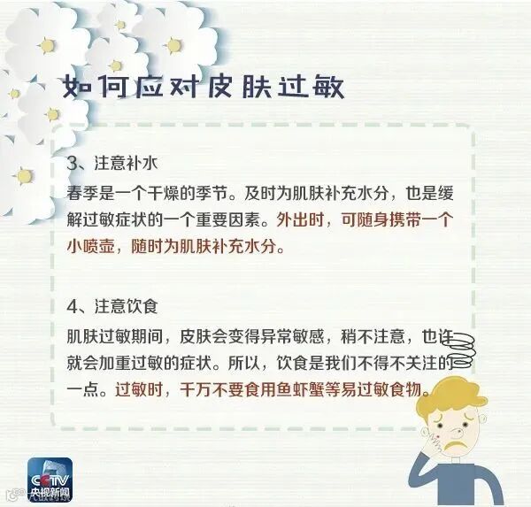 尽量减少外出,避免接触扬尘、柳絮等过敏因子,如果一定要外出最好戴上口罩;不要用碱性太强的香皂清洗皮肤;贴身衣物应选用宽松透气的纯棉衣物,不要穿羊毛或化纤织物。