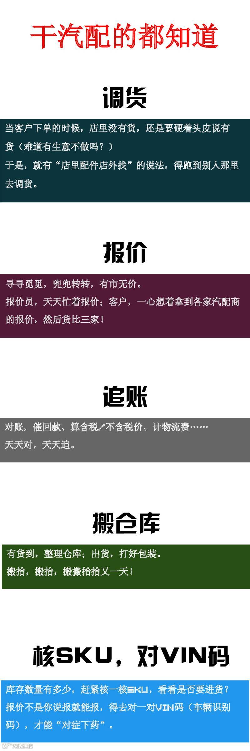 汽配行业是一个专业性非常强的行业,不懂得点行业知识,VIN码,车型分类,报价等,是很难在行业上吃得开的。 所以,外界的人想要进入汽配行业,是必须要从这些基本的东西学起。
