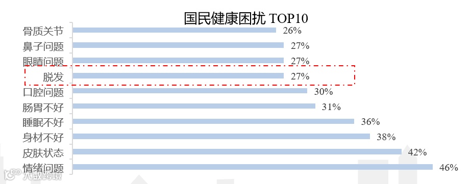 根据公开数据,中国的脱发人群总规模已经超过2.5亿,2020国民健康洞察报告中调研数据显示,脱发问题已经在国民健康困扰Top10中排名第7。