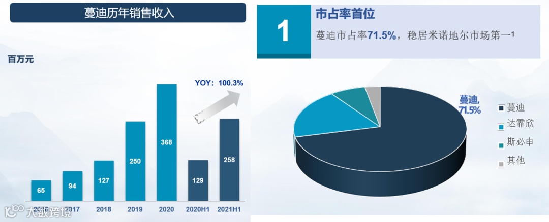 蔓迪经过超过20年的医院用药考验,是获得美国FDA,中国NMPA和《中国人雄激素性脱发诊疗指南》共同认证的安全,有效,便利的外用OTC生发药物。2021上半年,蔓迪销售额2.58亿元,同比增幅100.3%。根据CPA数据,蔓迪在同类产品中市占率71.5%,市场地位保持领先。