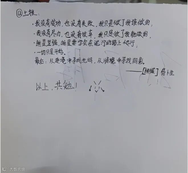 “孩子的大目标当然是考一所好的大学。”吴妈妈说,她理解儿子写下那段话的意思,就是告诉妈妈也告诉自己,考第一不是成功,没进重高也不是失败,他会在逆境中前进,母子俩互相打气。