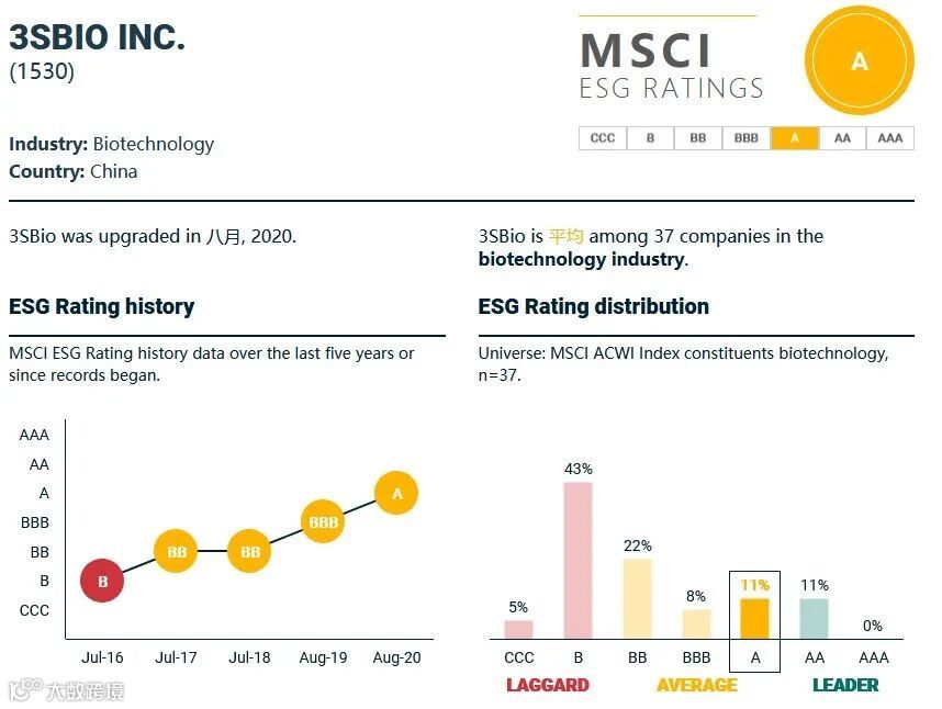 根据MSCI(明晟)最新公布的评级显示:三生制药MSCI ESG被评定为A级(2020年8月26日评级结果),该等级超过78%的全球生物科技行业公司。
