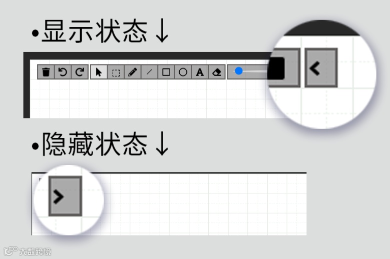在原有白板的基础上,我们增加了一些工具,比如 撤销返回功能、箭头功能、区域选中功能。若想隐藏白板工具,点击右边的隐藏按钮即可。