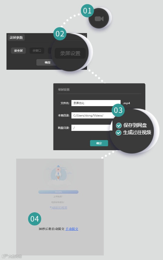 在录屏方面,我们加上了视频自动上传到主页的功能。点击录屏设置,勾选 “保存到网盘”,就会出现 “生成过往视频”的选项。勾选之后,结束录制退出教室时,会出现30s后自动提交的提示。