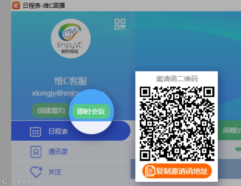 还添加了 “即时会议” 的按钮,老师只需要点击这个按钮,不需要创建课程即可进入教室,方便快捷。将鼠标放在 “即时会议” 按钮上,会出现二维码和链接,发给学生即可进入,课堂不限时间。