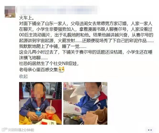 带孩子坐火车出游时,对面坐了一家人正在聊天。孩子非要强势加入,对面出于礼貌附和了一下,结果孩子来劲了,从赛尔号聊到了火箭发射……两个小时过去了,孩子的话题还没枯竭。
