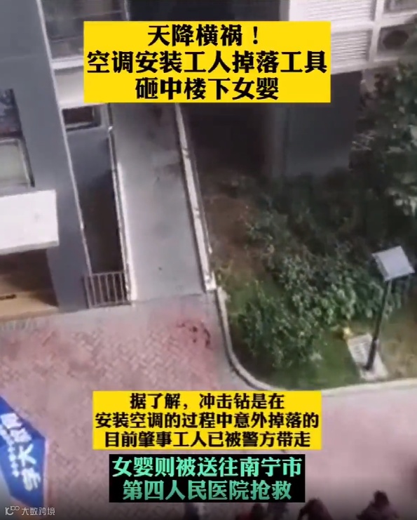 4月30日下午,广西南宁市阳光绿城小区高层住宅2栋,发生一起高空坠物事件。事发时,工人在小区高层安装空调,冲击钻却突然掉落,一位母亲怀抱着一岁的女婴返回住处,当步行至楼梯口前的斜坡位置,怀中女婴被冲击钻砸中头部,因女婴伤势过重,当晚死亡。