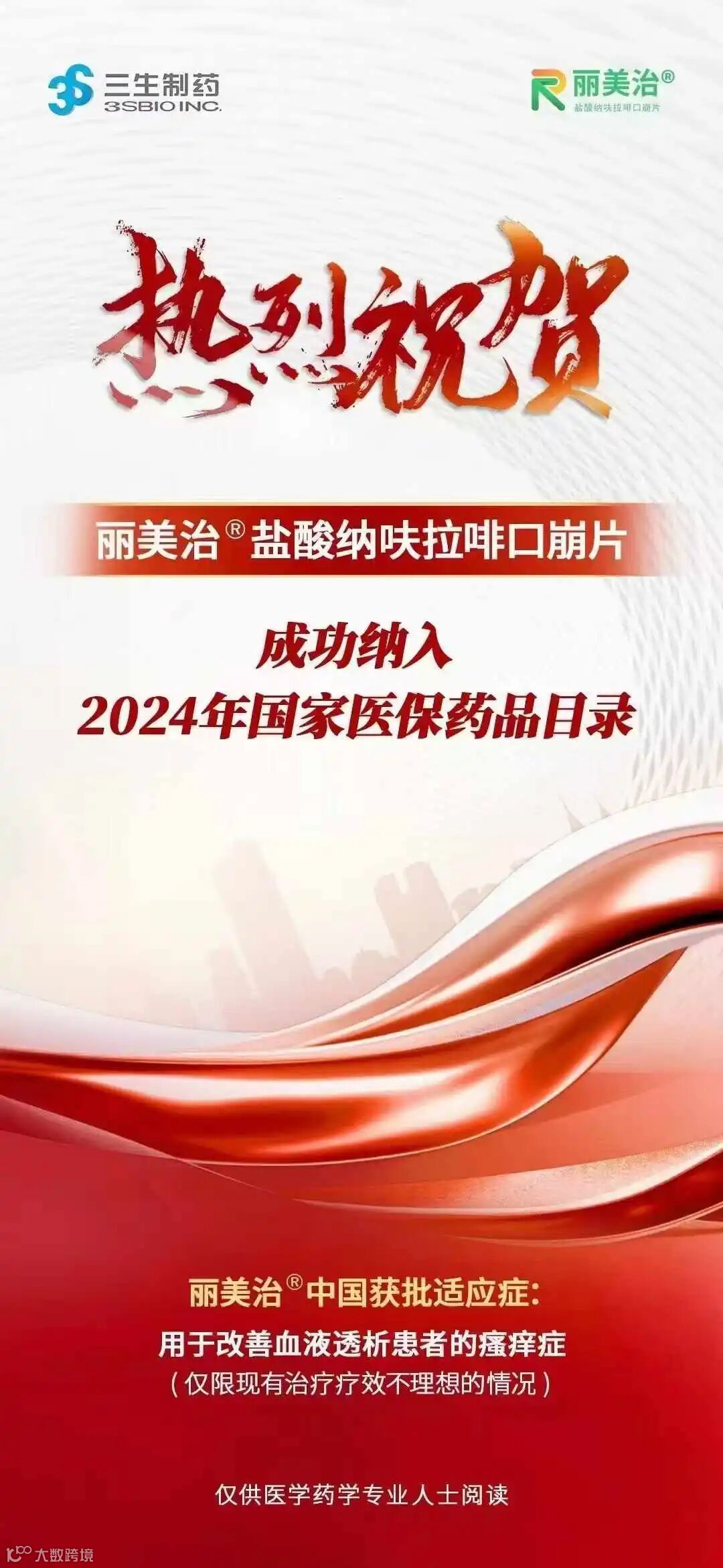 2024年11月28日,《国家基本医疗保险、工伤保险和生育保险药品目录(2024 年版)》(下称:新版医保目录)正式公布。盐酸纳呋拉啡口崩片(丽美治®)成功被纳入新版医保目录。根据国家医保局公告,新版医保目录将于2025年1月1日起正式实施。