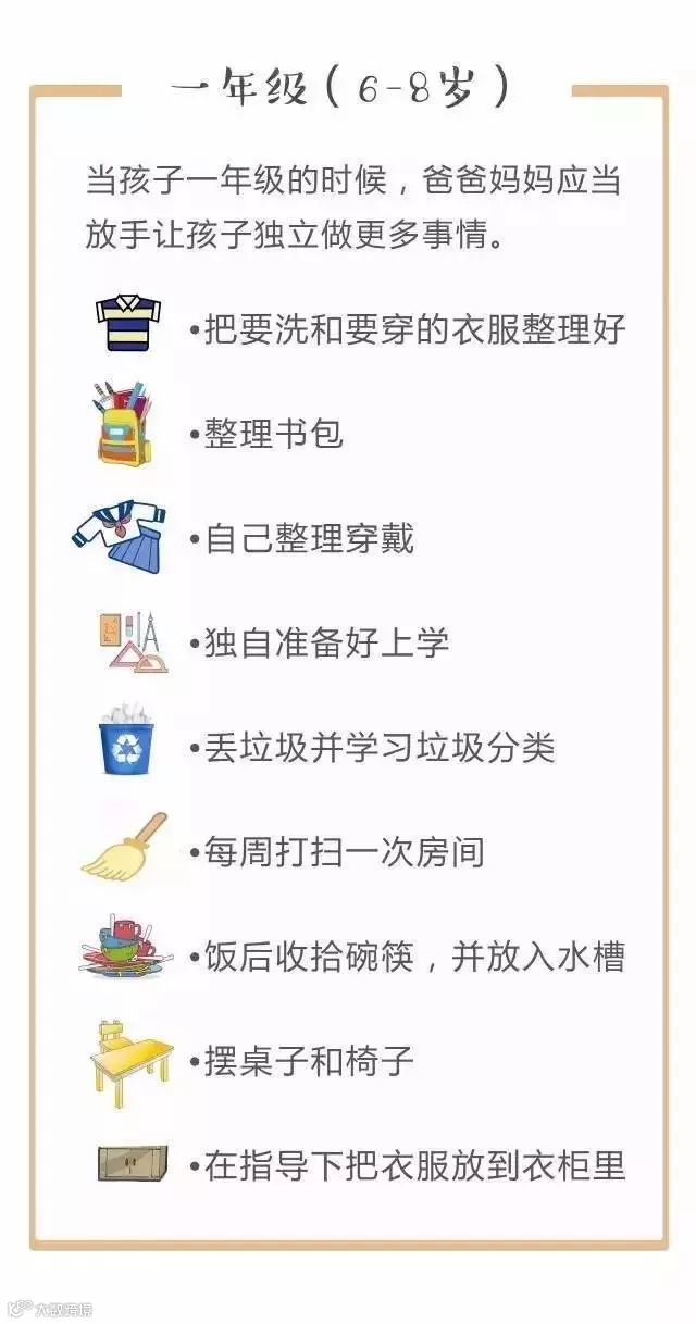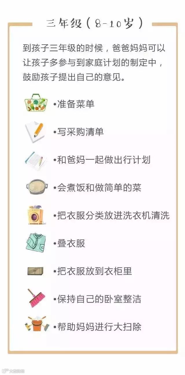 对照下面的家务年龄表,父母可以更好地把握什么年龄的孩子该做哪些家务。