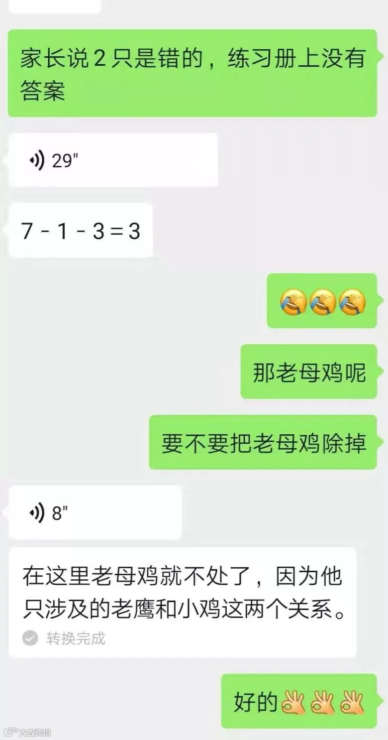 看了题后自己也不是很确定,确实有争议,很能理解现在家长的焦虑。但从数学的角度来说,这道题里只涉及老鹰和小鸡两个关系,老母鸡不用除,答案应该是3。