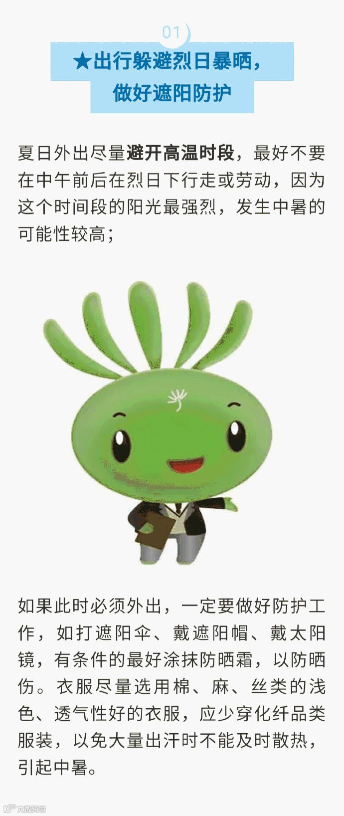 夏日外出尽量避开高温时段,躲避烈日暴晒,做好遮阳防护;及时饮水,适当补充电解质;用水冲洗,及时散热;合理饮食,保证营养;合理安排作息时间,保持充足睡眠;随身配备防暑药品……一起来看看这些高温防暑的正确打开姿势!