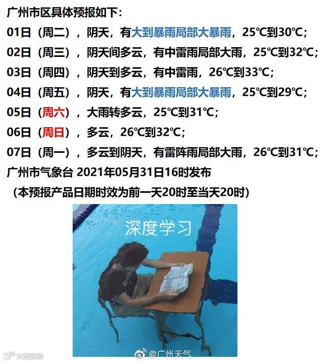 6月2日-3日白天,韶关、清远、河源和珠江三角洲北部市县有大雨到暴雨,局部大暴雨,其余市县有(雷)阵雨,局部大雨。