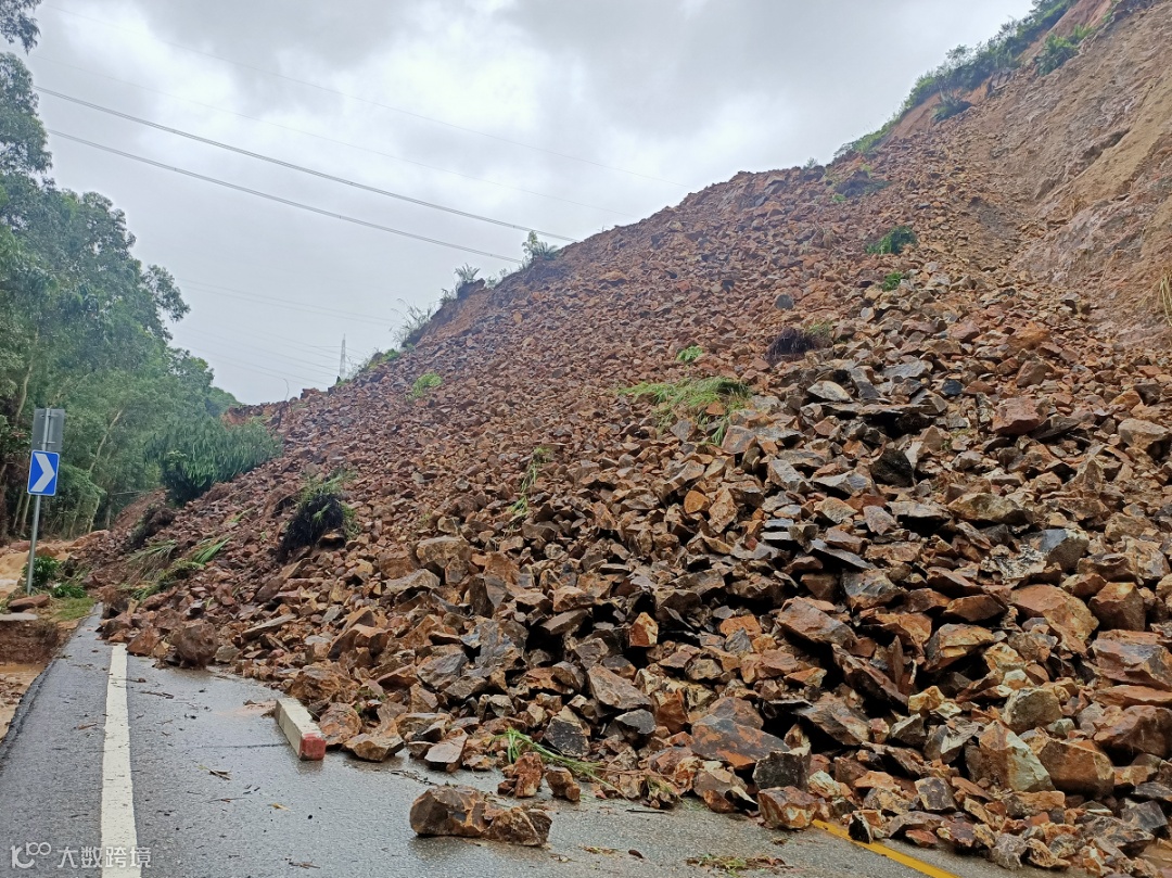 (5月31日6时20分,国道G355线K940+400~K940+650龙华风门凹路段受到连续强降雨影响,路基左侧上边坡山体出现大面积滑坡现象,坍塌土石方掩埋公路,导致全幅道路交通中断。来源:龙门县公路局、龙门县交通运输局)
