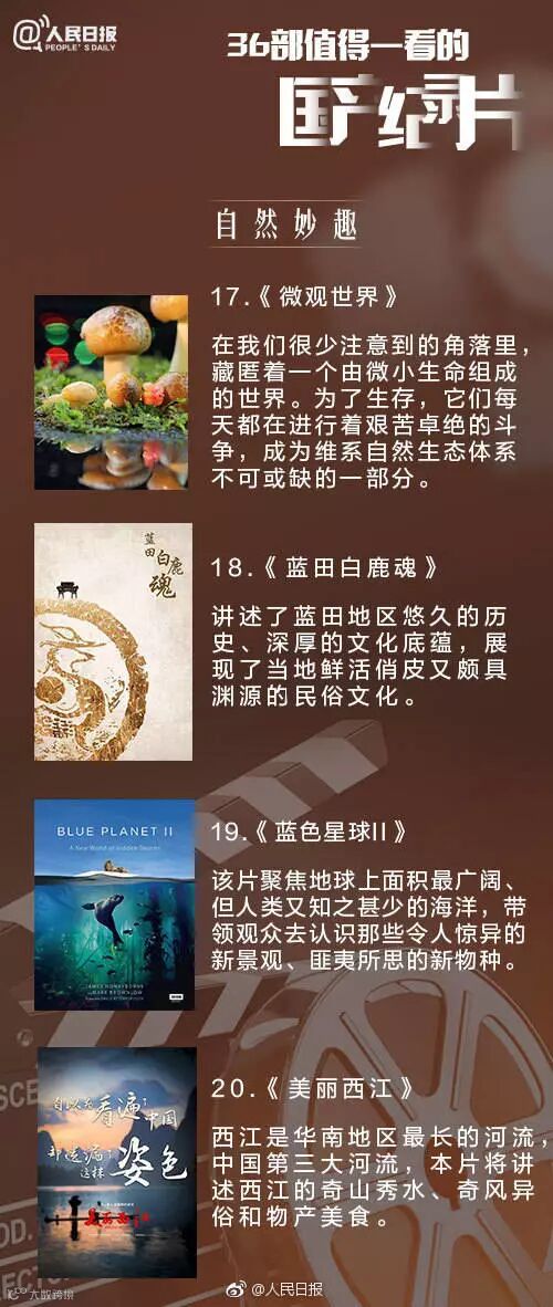 一部经典的纪录片,能拓展视野、增长学识、涤荡心灵。《微观世界》聚焦生活中很少留意的微观世界;《航拍中国》以空中视角俯瞰美丽中国;《改变世界的战争》还原世界反法西斯东方主战场的历史全貌……暑假,家长带着孩子一起看看纪录片吧!