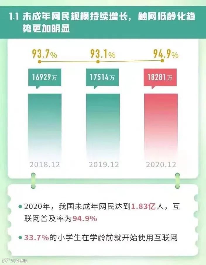 据共青团中央、中国互联网络信息中心(CNNIC)等联合发布的《2020年全国未成年人互联网使用情况研究报告》显示:2020年,我国未成年网民达到1.83亿人,互联网普及率为94.9%;超过三分之一的小学生在学龄前就开始使用互联网,孩子们首次触网的年龄越来越小。