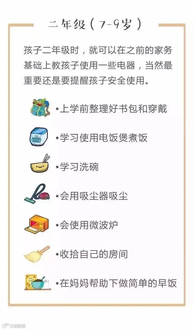 对照下面的家务年龄表,家长们可以更好地把握什么年龄的孩子该做哪些家务。