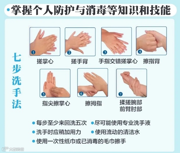 父母一定要教会孩子规范的洗手方法:洗手时,应使用肥皂或洗手液仔细揉搓手心、指缝、指关节、大拇指、指尖、手腕,再用流动的水冲洗不少于20秒钟。外出随身带上手消毒剂或消毒湿巾,在不具备洗手条件的时候,及时进行手消毒。