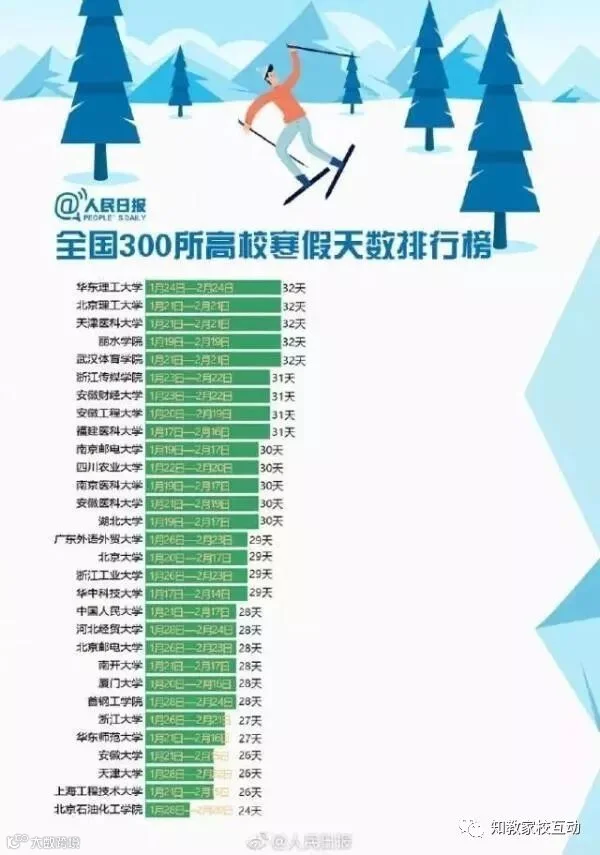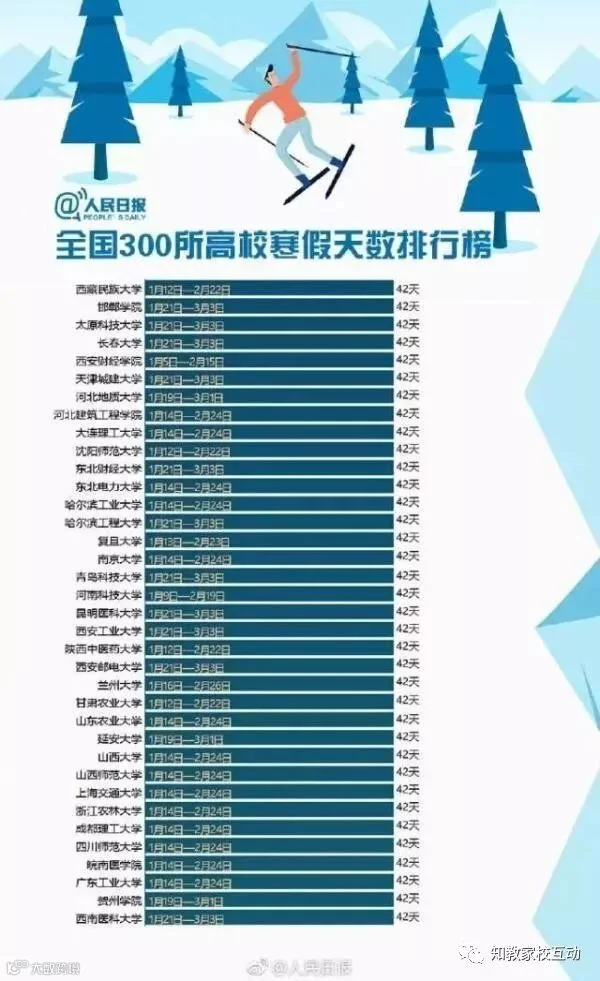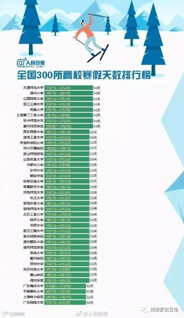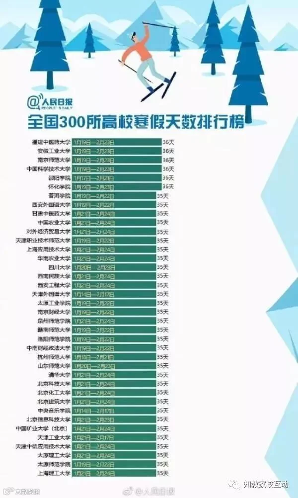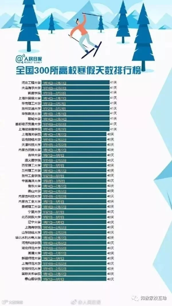 特意查了一下母校的校历,小编的母校寒假共39天,虽不至于上榜前五十,也是中等的了。哎哟,不错哦!