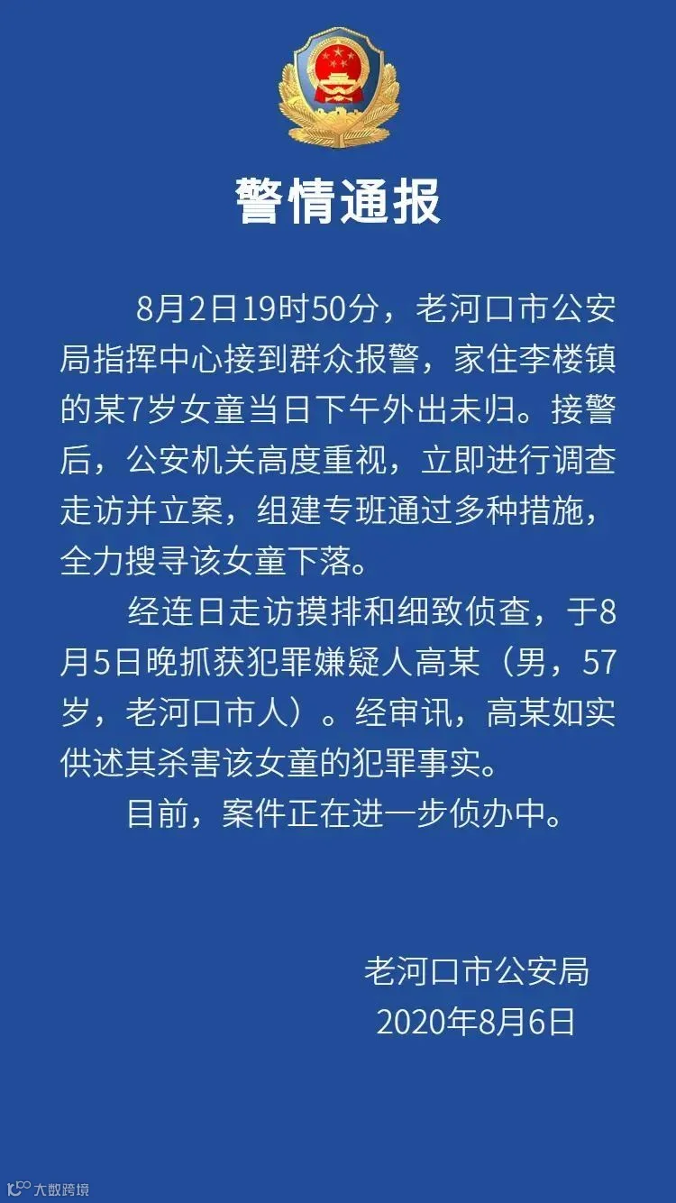 8月6日,湖北省老河口市公安局发布警情通报:8月2日,当地公安局接到群众报警,家住李楼镇的某7岁女童当日下午外出未归。经侦查,警方已于8月5日晚抓获犯罪嫌疑人高某(男,57岁,老河口市人)。