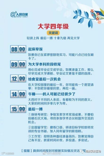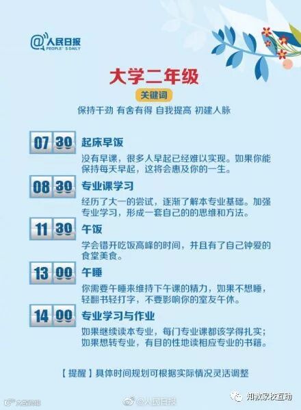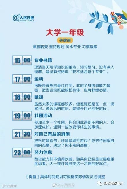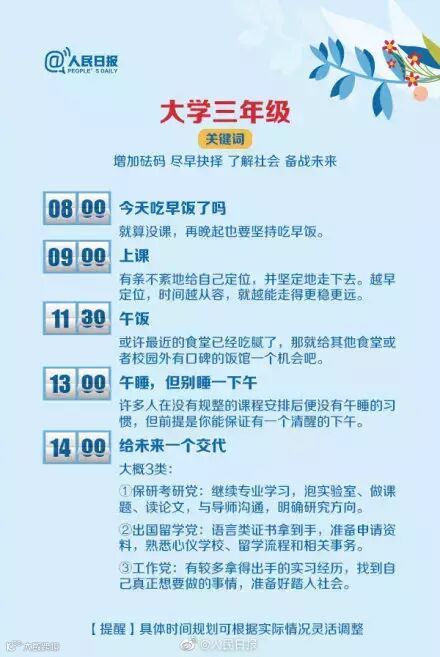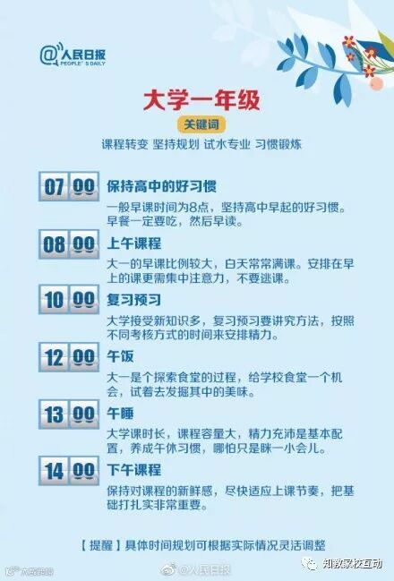 的态度,决定了你未来的高度。大学的每个年级都该明白自己的位置,清楚自己的方向:考证、读研、工作、出国留学…早些规划,将来就能多些选择。最佳作息表↓↓供参考,转给初入大学校门及未来的大学生们!