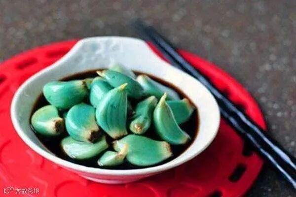 腊八这天,华北地区要泡腊八蒜。剥了皮的蒜瓣,用醋泡在坛子里,密封置于阴凉处,几天后,原本白生生的蒜瓣就变得碧玉一般。