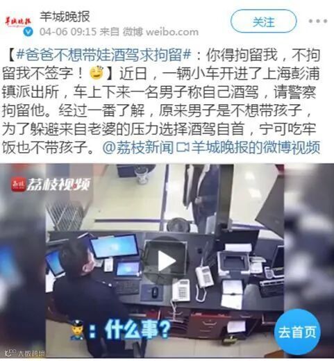这月初还有一条奇葩的新闻:一个爸爸不想带娃,直接酒驾求拘留,他宁可选择被关也不要带孩子。
