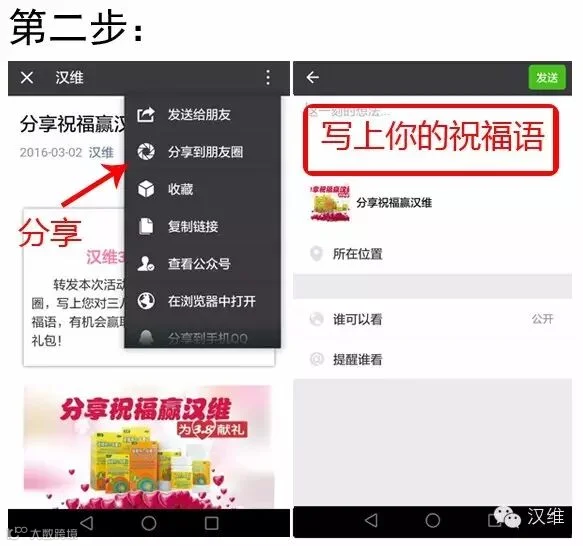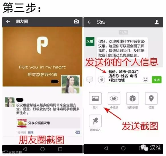 ③截图发送:发送后,截图发送给我们的汉维公众号,同时写上你的详细地址(省份、城市+具体门店名称+姓名+电话+收货地址)给我们,将有机会获得三八节大奖;