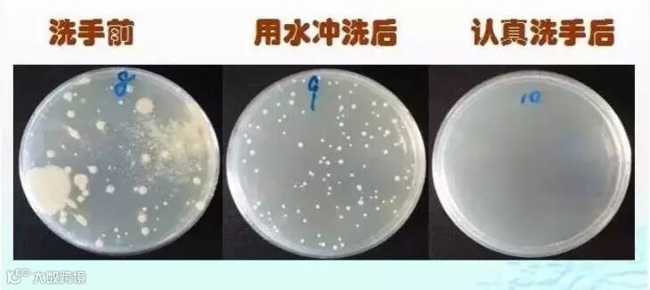 △ 洗手前、用水冲洗后和认真洗手后的手部菌落图