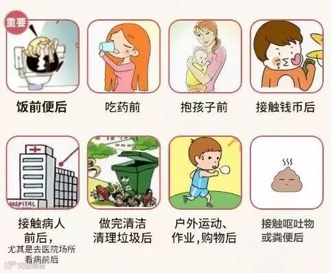 使用厕所,擦鼻涕、咳嗽或打喷嚏,接触钱币,换尿片,照顾病人,接触呕吐物或清理粪便,处理未熟的食物,处理伤口,处理垃圾,使用公共交通工具或设施,外出回到家等。